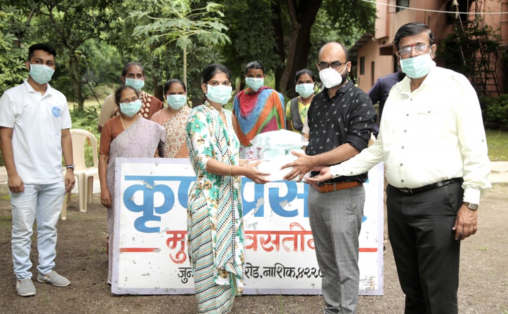 The distribution of 2100 masks and 2100 sanitary pads was done by Thursday in the span of four days. The items were distributed in different parts of the Nashik district. Datyane, Mukhed in Niphad Taluka, Velunje in Triambakeshwar area, and Krupa Prasad Ladies Hostel at Mumbai-Agra road are the beneficiaries.